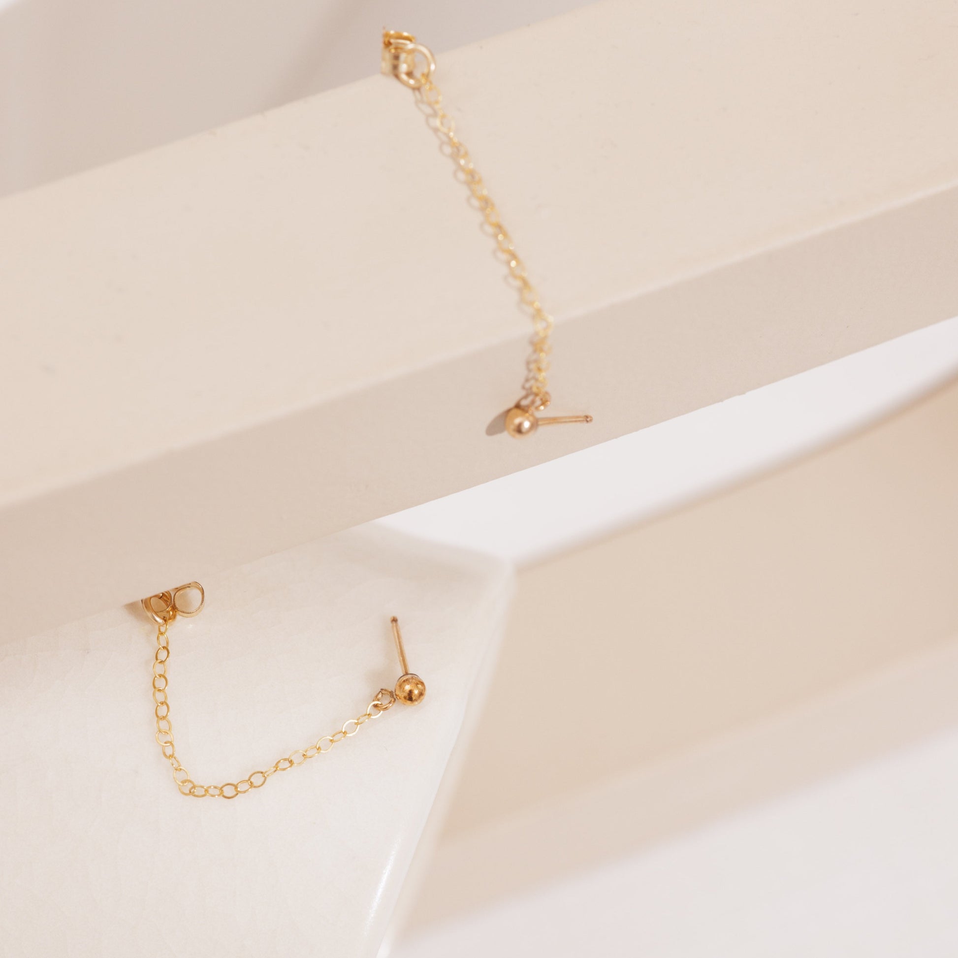 A bold twist on a classic stud. These edgy yet sophisticated earrings feature a delicate ball chain that hangs approximately ¾" and connects from the front post to the ball backing. The perfect blend of minimal design and statement style.